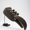 A typical body mask, symbolizing fertility. The large, protruding navel is surrounded by three large circles and draws the viewer’s eyes. Two carved, striped lines stretch upward from the navel. The breasts and nipples are carved with great precision, and above them the decorative stripes continue up to the edge of the mask.