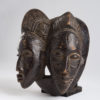 Woman’s mask painted in red, symbolizing love, and decorated—on the forehead and cheeks—in white, denoting communion with tribal ancestors. The eyes are open wide and the nose is carefully drawn; the mouth, pulled upward at the corners, is colored red, and the small ears lay close to the sides of the head. On its head are two hollow crowns facing in opposite directions, which represent wisdom and man’s ability to direct his thoughts.