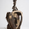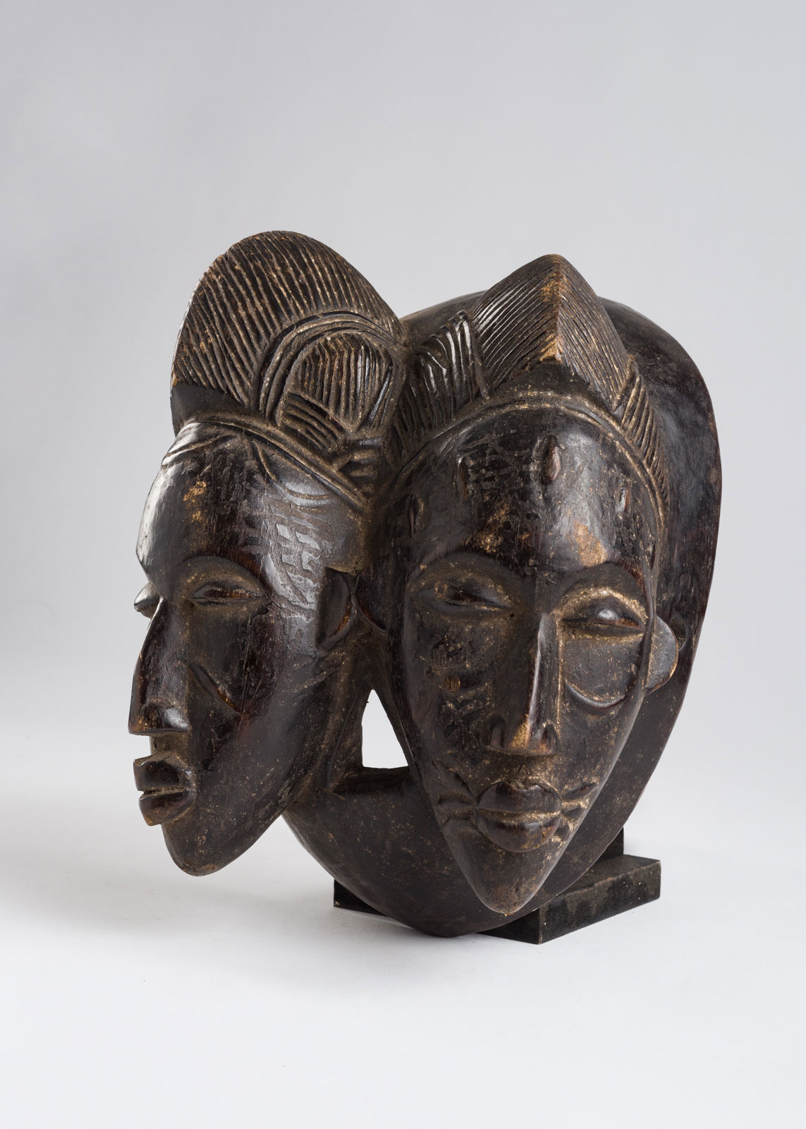 Mask made of two, nearly identical joined heads, one male and one female. The faces are chiseled with care and the cheeks and forehead feature subtle decoration. To the woman’s face were added delicate embellishments around the mouth. The top of the mask is made of two hats in the typical style, connected in the middle. The entire mask is painted black as a symbol of power, and promotes the idea of unity as the source of livelihood and safety.