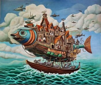 תוך כדי דיאלוג עם ה AI לפידוס לוקחת את הדימוי המטורף שנוצר וממשיכה אותו הלאה בשמן ומכחולים בעבודה על הקנווס. לפידוס עושה שימוש מושכל בבינה המלאכותית.