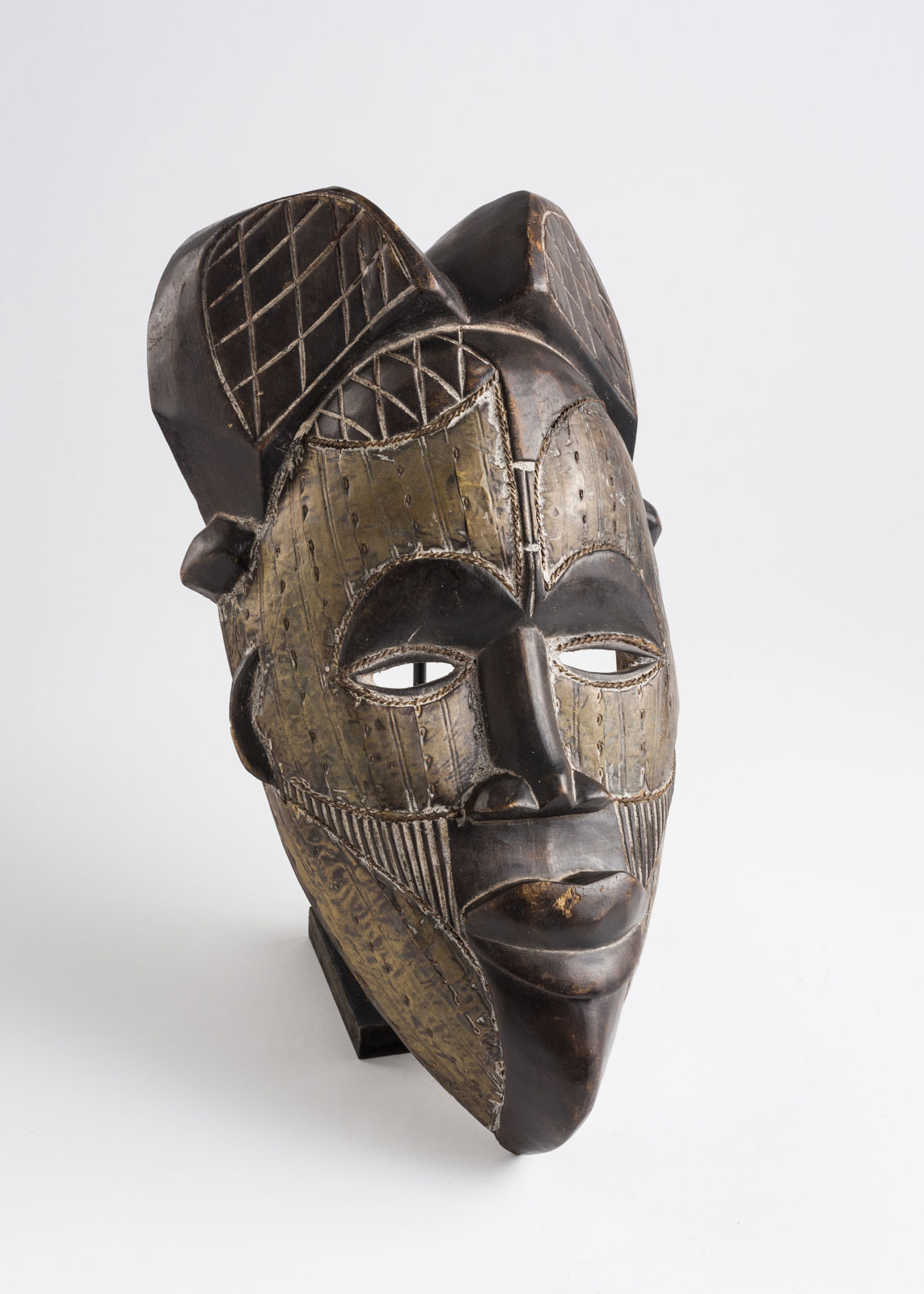 Mask of a cheiftain wearing a typical headdress. The sides of the face are covered in metal, a sign of power and wealth.