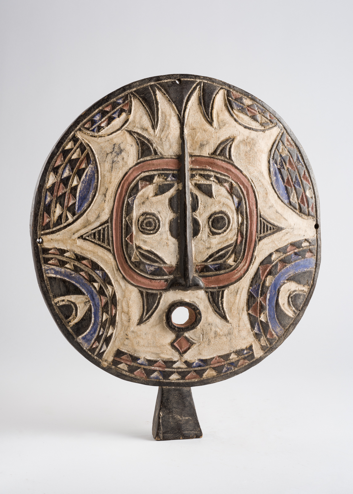 A sun-shaped shield commonly used in dances during prayer ceremonies for livelihood and protection. The sun symbolizes protection, livelihood, health, and all that is good in the life of the tribe. The shield is painted in red for love, blue for health, black for protection, and white for communion with tribal ancestors. The lines delineating the geometric pattern symbolize the family unit and project a visual message: Joint effort begets strength, livelihood, protection, and a good life. Two small, human-shaped faces are carved at the center of the shield, with two small, round eyes; a small, round, hollow mouth; and a long nose that divides the face in two and merges with the geometric pattern that fills the space. A handle at the bottom is used to hold the shield up during ceremonial dancing.