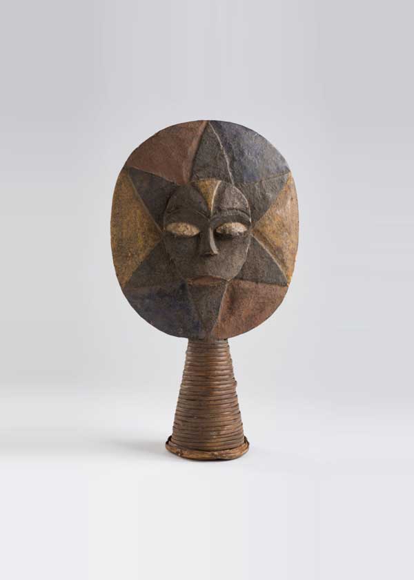Sun-shaped mask painted red and white, symbolizing love and communion with tribal ancestors, respectively. The mask is decorated with triangles in different colors: blue for health, red for love, black for power, and off-white for communion with tribal ancestors.