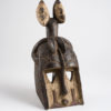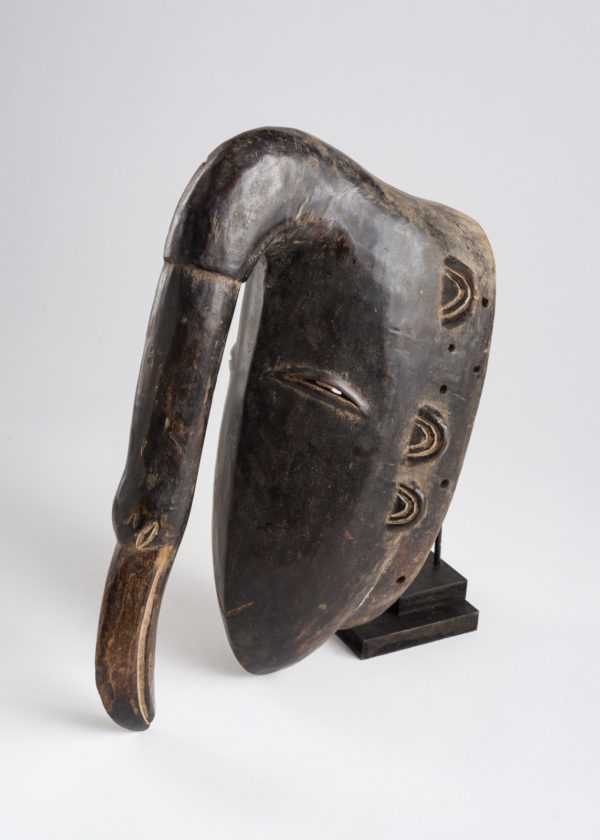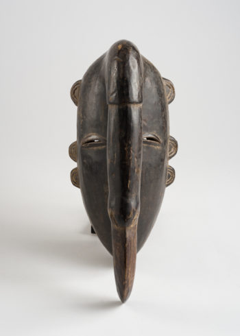 Man’s mask in the shape of an elephant’s head. A long trunk is raised upward along the length of the face, and two slits on either side are used to indicate eyes. Three small ears stick out on both sides of the head. Traditionally the elephant represents livelihood and safety.