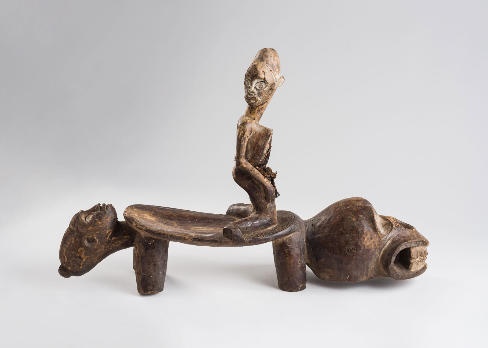 Large sculpture of an ancient, four-legged reptile with the figure of a man on its back. The front portion comprises a large head/skull whose mouth is opened to reveal two lines of teeth. A gaping hole serves as the nose and two sunken eyes contain pupils made of glass. On the reptile’s back rests a man on his knees: In one hand, he holds a red, square-shaped heart, while the other hand rests on one knee. Around his waist is wrapped a rope for decoration, and his elongated head turns to look behind him. The reptile’s tail is shaped like the head or mask of a man; from its open mouth peeps a small tongue. The sculpture represents the ancient myth, common to many cultures, concerning the transition from the earthly world to the next one.