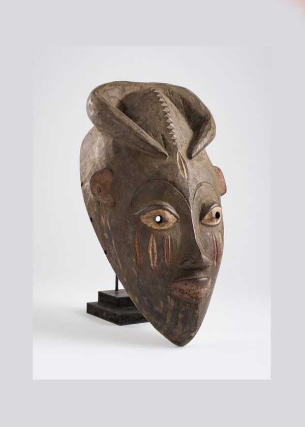 Woman’s mask from the Ligbi, a tribe whose empowered females do most of the harvesting and planting for their people. Her mouth sticks outwards and is painted red, the color of love, and four stripes of red and white decorate her cheeks. Her eyes are open wide and painted white, while her eyebrows are draw in a thin line. Her forehead is encircled with a crown of curved horns, representing strength and power. Down the length of her forehead runs a line of short grooves painted white, a mark of wisdom.