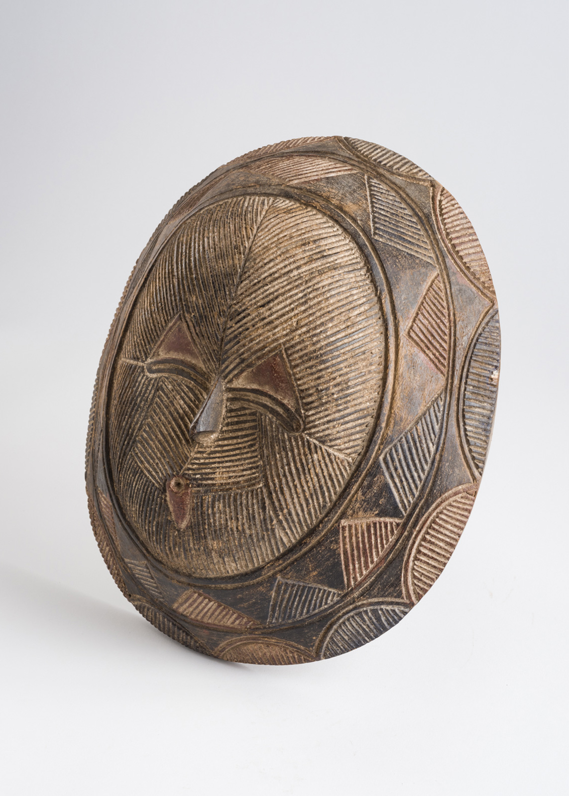 Carved shield on whose surface is embossed a mask of the face of a man. The face is painted red, black, and white, symbolizing love, power, and communion with tribal ancestors, respectively. The entire shield is embellished with geometric shapes made of closely etched lines, representing strength and unity.