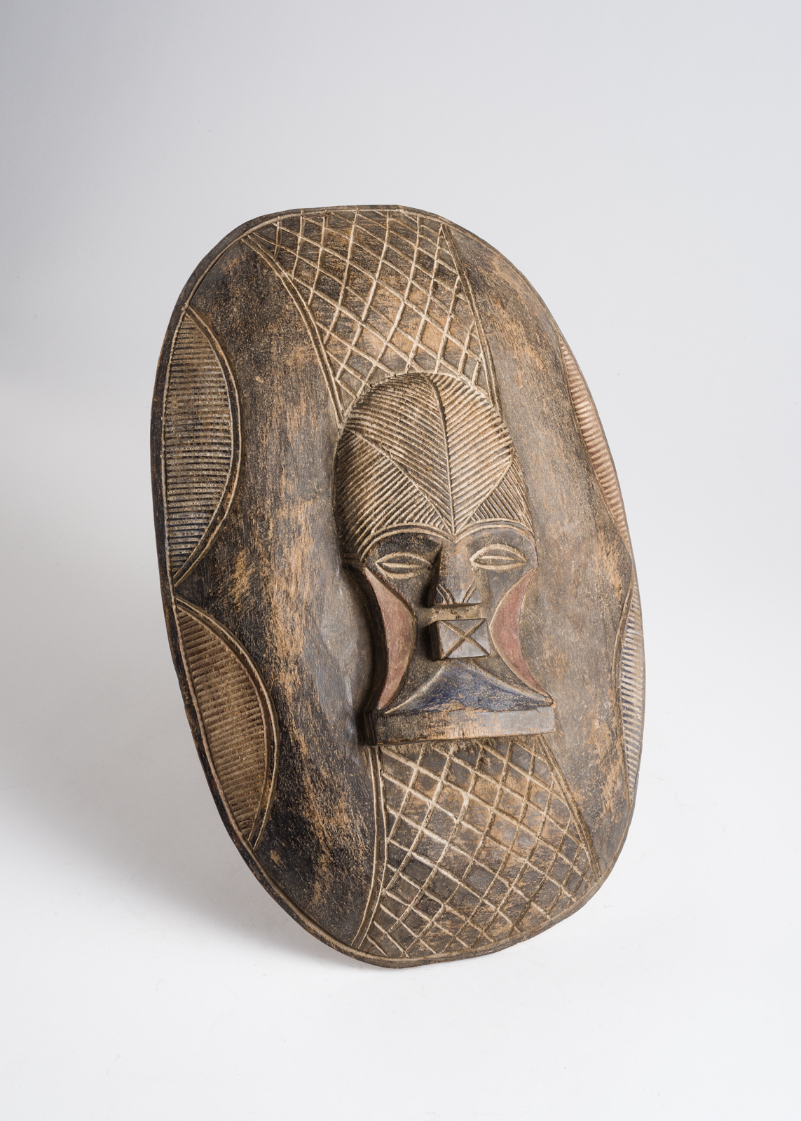 Carved shield in whose center is embossed a mask in the shape of a sun. The sun’s face is decorated with red for love, black for power, and white for the communion with tribal ancestors. The entire shield is embellished with geometric shapes made of closely etched lines, representing strength and unity.