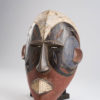 A man’s mask typical of the Warka tribe, worn during ceremonies intended to elicit strength, security, and livelihood for tribe members. The face is elongated, and the nose similarly long and narrow; the eyes are thin, hollow slits that stretch the width of the face. The mouth is carved with great care, and the entire front of the face is covered with gilded metal in a delicate cross-hatch design. The ears and hat are decorated with vivid blue-green threads.