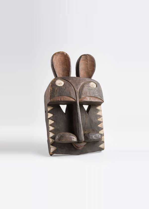 Mask expressing great wisdom. The two rabbit ears, painted red, symbolize love, understanding, and the ability to listen, while the two eyes underneath, painted white, symbolize the ability to commune with tribal ancestors. Below the forehead is another set of eyes shaped like triangles, symbolizing the capacity for soul searching and introspection. A large mouth is painted red, symbolizing love, and two small triangles on either side of the mask are painted in white, symbolizing the communion with tribal ancestors.