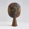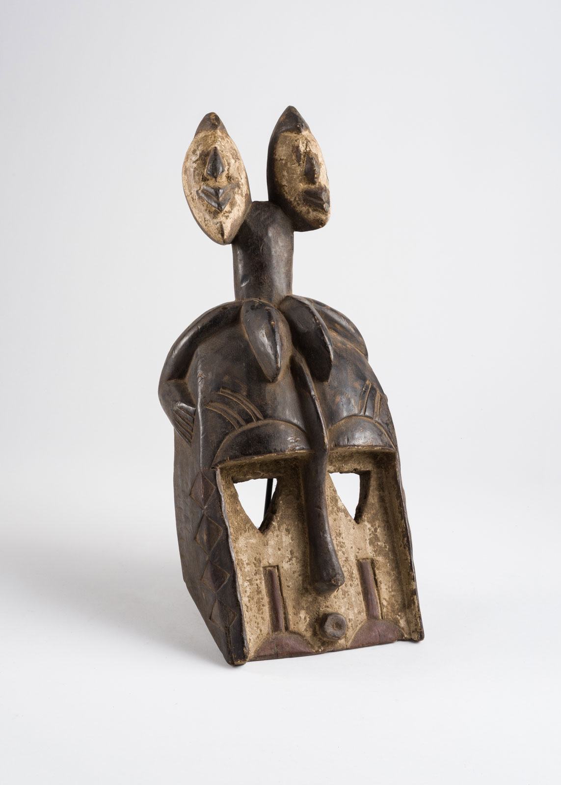 Mask with three mouths, painted red as a symbol of words of love. One mouth is shaped like a circle, and the other two are half-circles with a line extending upward toward the eyes. On the upper part of the face are two eyes shaped like upside-down triangles; they are hollow to allow the wearer to see through. On the top of the mask sits a figure with two, white-colored heads whose facial features could be those of a woman or a bird.